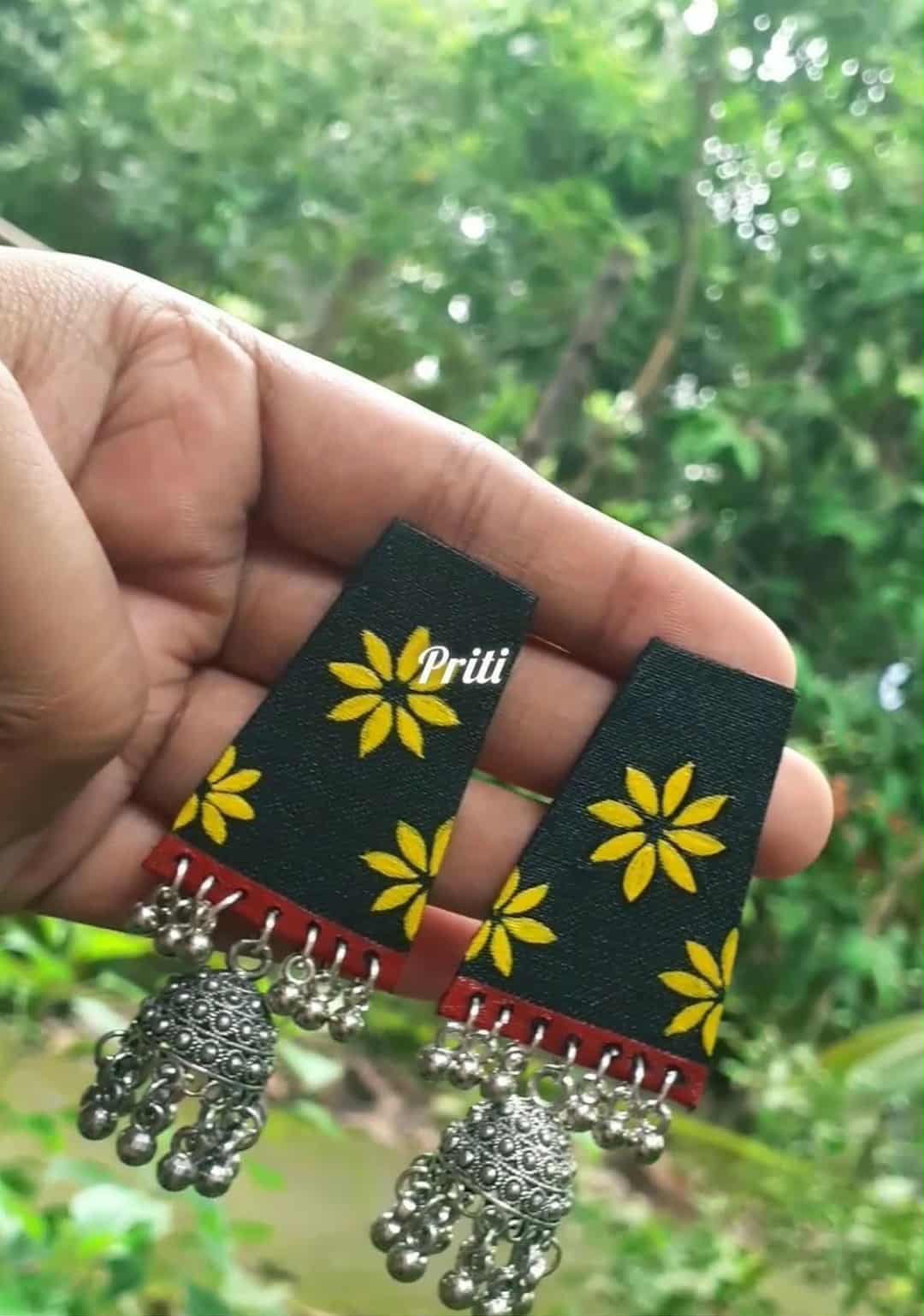 Designed on premium fabric with bright yellow floral art, these earrings feature detailed oxidized silver jhumka drops that create a perfect Indo-ethnic vibe.